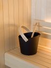 Zestaw zawiera ceber, chochlę, termometr, higrometr i klepsydrę - wszystko w pięknej, matowej czerni. Wykonany jest z aluminium, które jest anodowane i piaskowane, co zapewnia najwyższą jakość wykończenia i trwałość. Uchwyt wiadra to jasna brzoza, wzmocniona osiką. Oprócz stylowego wyglądu, wiadro posiada sprytną funkcjonalną wylewkę, która umożliwia dokładniejsze nalewanie wody.